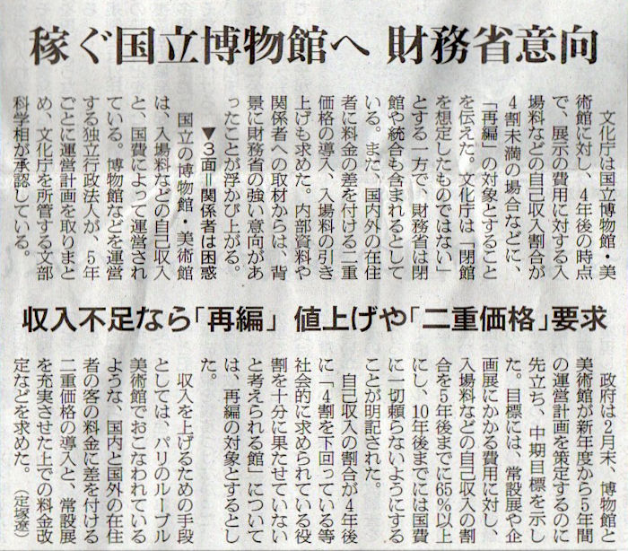2026.3.9スタッフ注目記事 カテゴリー: ピックアップ 本日は朝日新聞朝刊から、「稼ぐ国立博物館へ 財務省意向(2026年3月9日版 [51772] 1面)」の記事をオススメします. 2026年3月9日