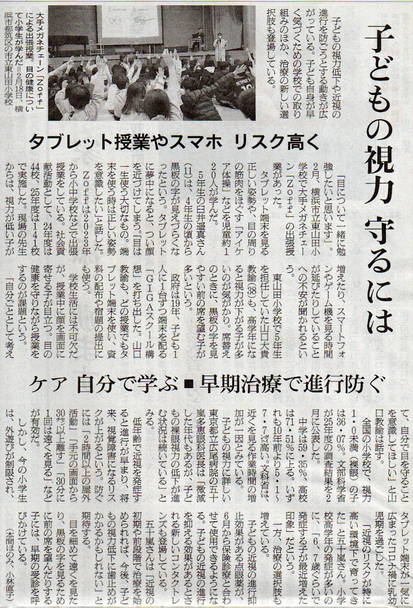 2026.4.7スタッフ注目記事 カテゴリー: ピックアップ 本日は朝日新聞朝刊から、「子どもの視力 守るには(2026年4月7日版 [51800] 25面)」の記事をオススメします. 2026年4月7日